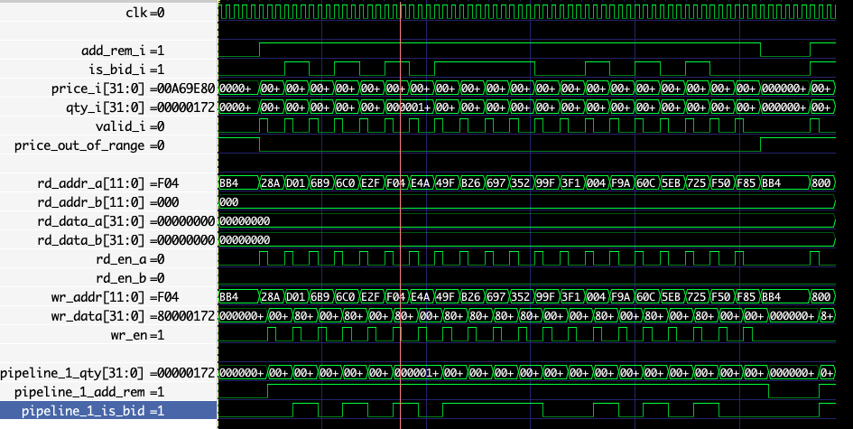 In between, the orders book received the same ref twice, but wrote to the associated address multiple times (dashed blue lines) due to bad address mapping causing expected collisions. Anyway, this corrupts data and causes some problems like this. So I guess the next big fix is to make sure the address mapping is right, but that will be for a future post, as I also have a real job and limited time during my weekends during which I want to conduct other projects.