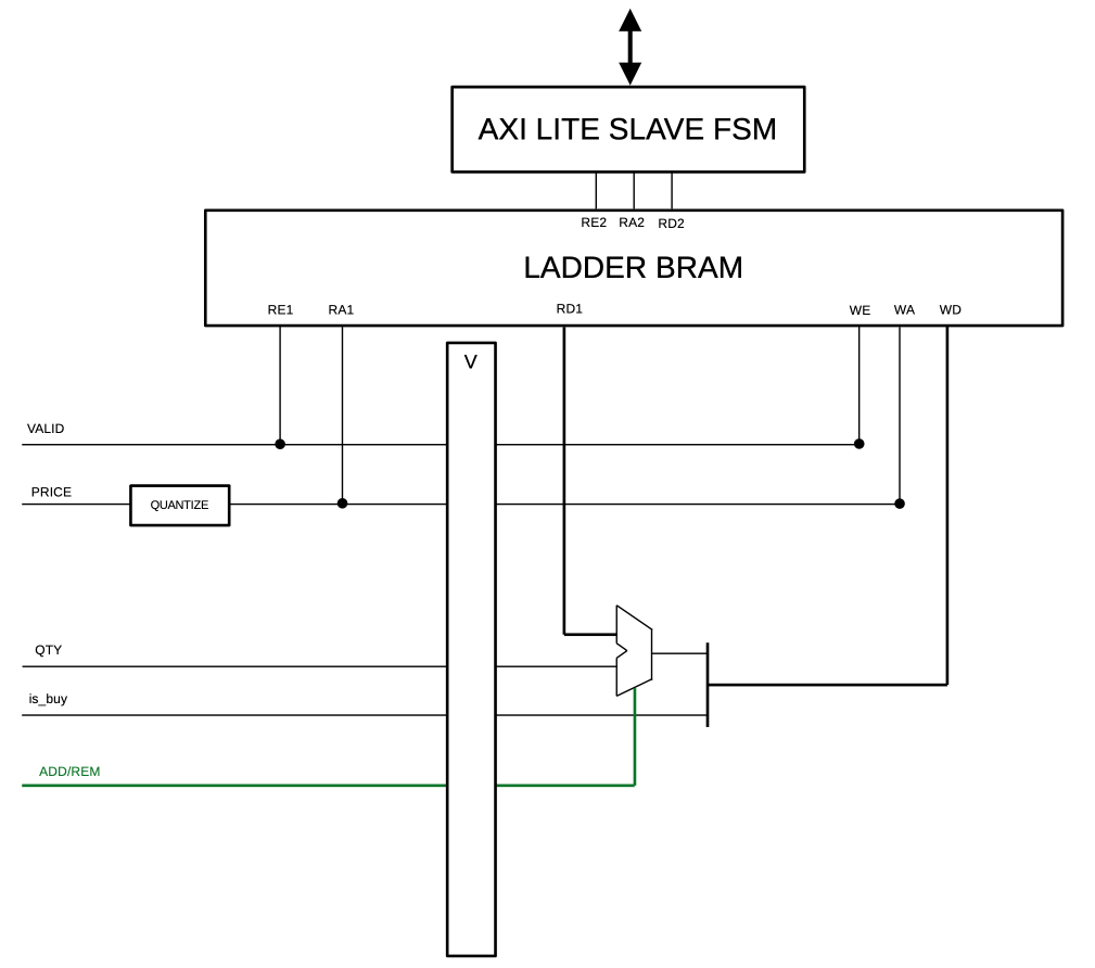 The scheme is very self-explanatory here, a simple 2-stage pipeline, first we read from the BRAM using our quantized address (derived from price) and then we compute the new quantity for that given price before storing it back.