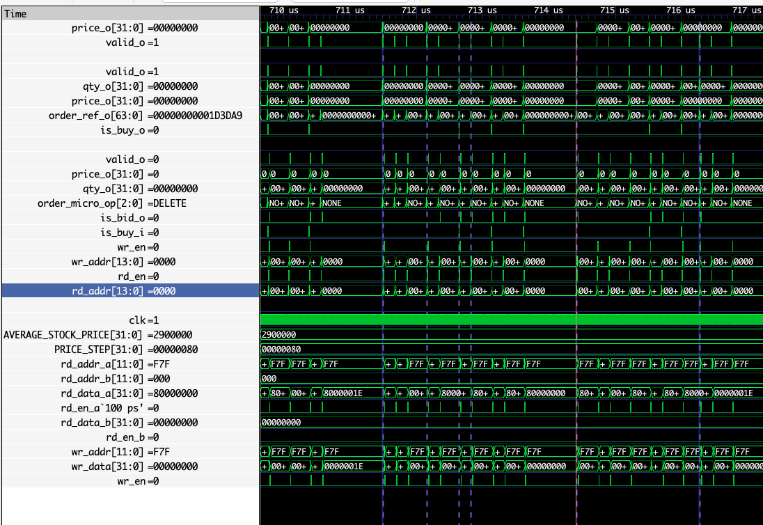 Again, we generate signals that mimic what the order bookkeeper will generate and in the testbench, we keep track of a golden reference we compare the BRAM state to.